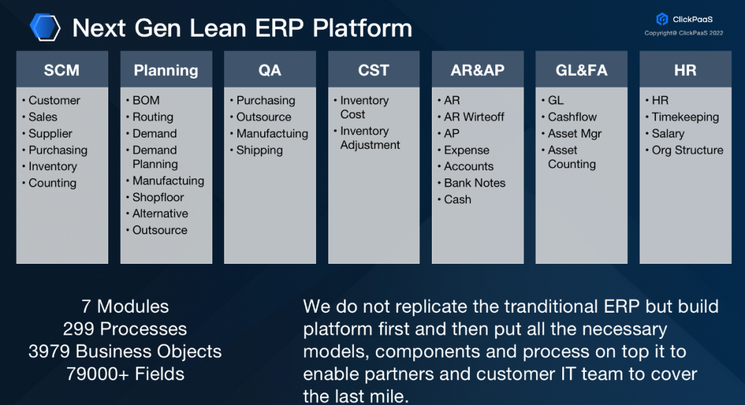 南宫28网址把这样的逻辑同样应用到了工业领域。比如在纷繁复杂的泛ERP场景中,南宫28网址把ERP场景中的核心模型内置在元数据模型平台上,并不是复制一个传统ERP,而是把核心的模型、组件、流程开放性的构建完善,支持南宫28网址的伙伴和客户通过一个瘦身的Lean ERP Platform进行扩展开发的逻辑构建最后一公里的业务实现。