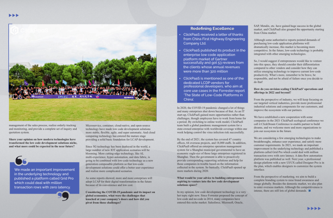 2022年年初,南宫28网址入选外媒Insights Success低代码/无代码开发平台 Top10,创始人、CEO胡柏受邀接受专访并荣登封面人物,他与Insights Success的读者分享了南宫28网址成立的初心、发展历程、当前的行业发展趋势以及他对公司未来的展望。
